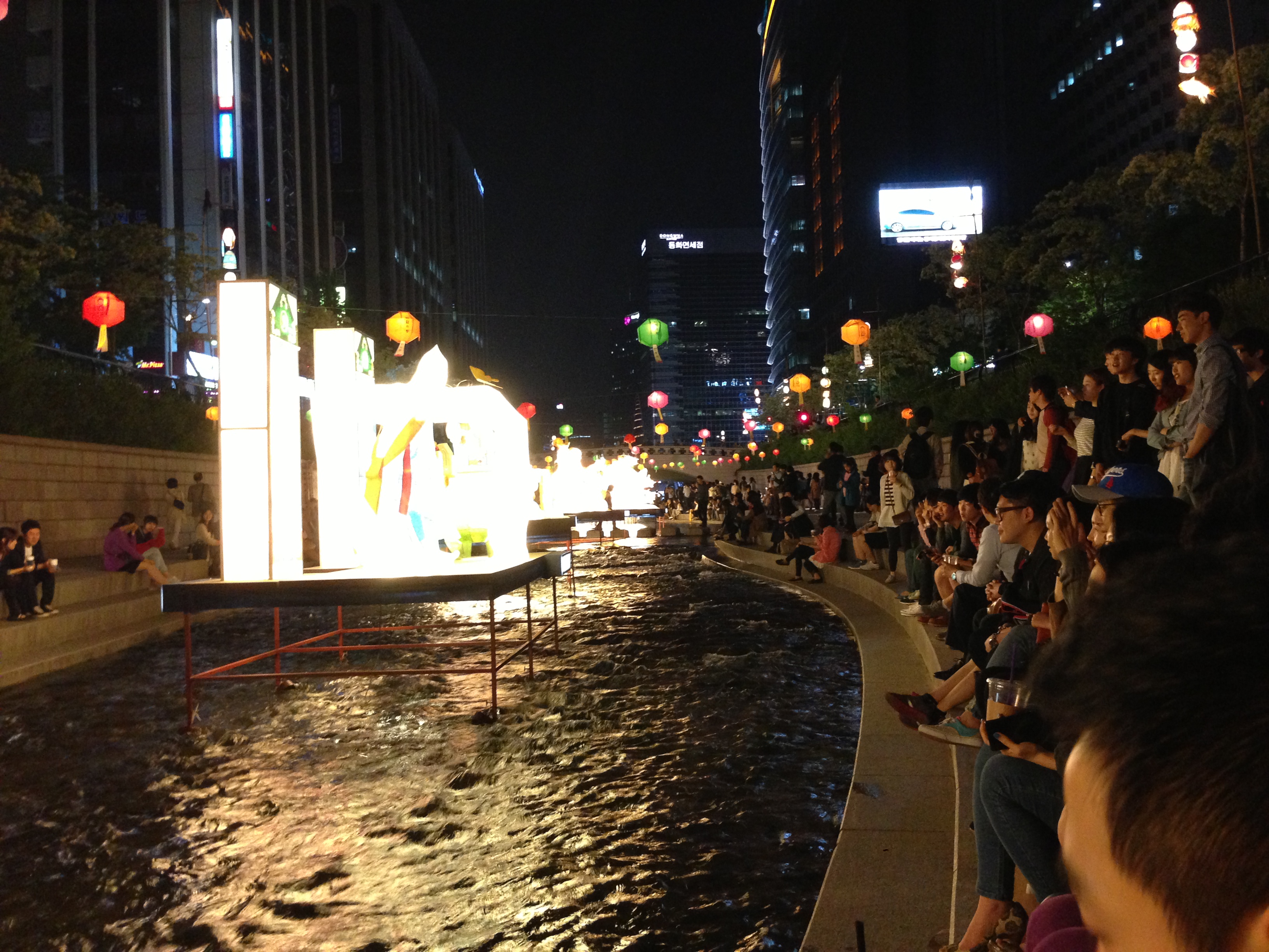Night time in Seoul…the lighted lotus lanterns in the river are in honor of Buddha’s birthday: