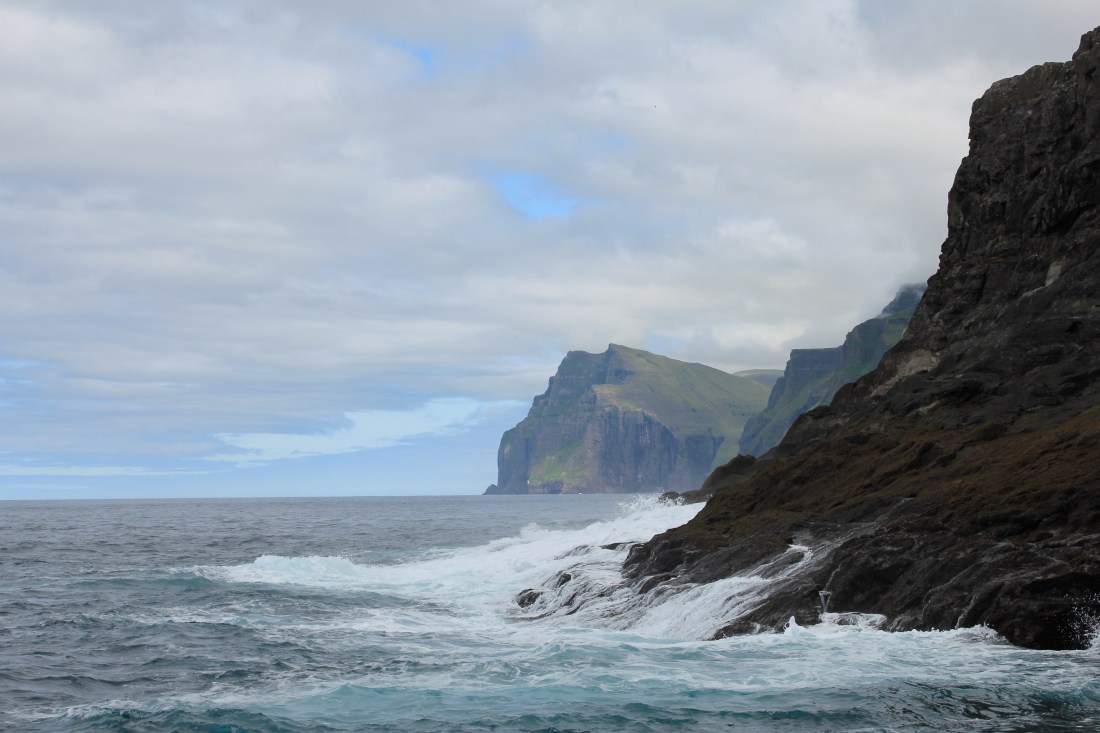 Sheep that are roaming free all over the island could be seen walking along the edges of the cliffs, which was weird to see given all the “safe” land away from the cliffs. Also, many varieties of birds were seen flying around and nesting in the cliffs Then, the boat hands began passing out hard hats for us to place on our heads. At first, I thought, “Wow, they really want to make sure we are safe, even though we were still pretty far from the cliffs.” That’s when the little boat started heading to the caves that had been created by the waves and sea currents. Floating inside the caves and between the cliffs was totally breath-taking!!