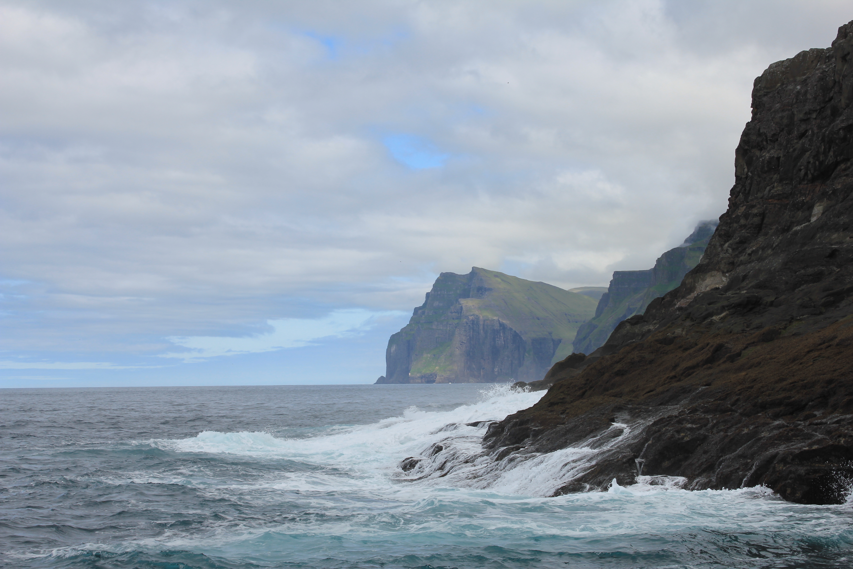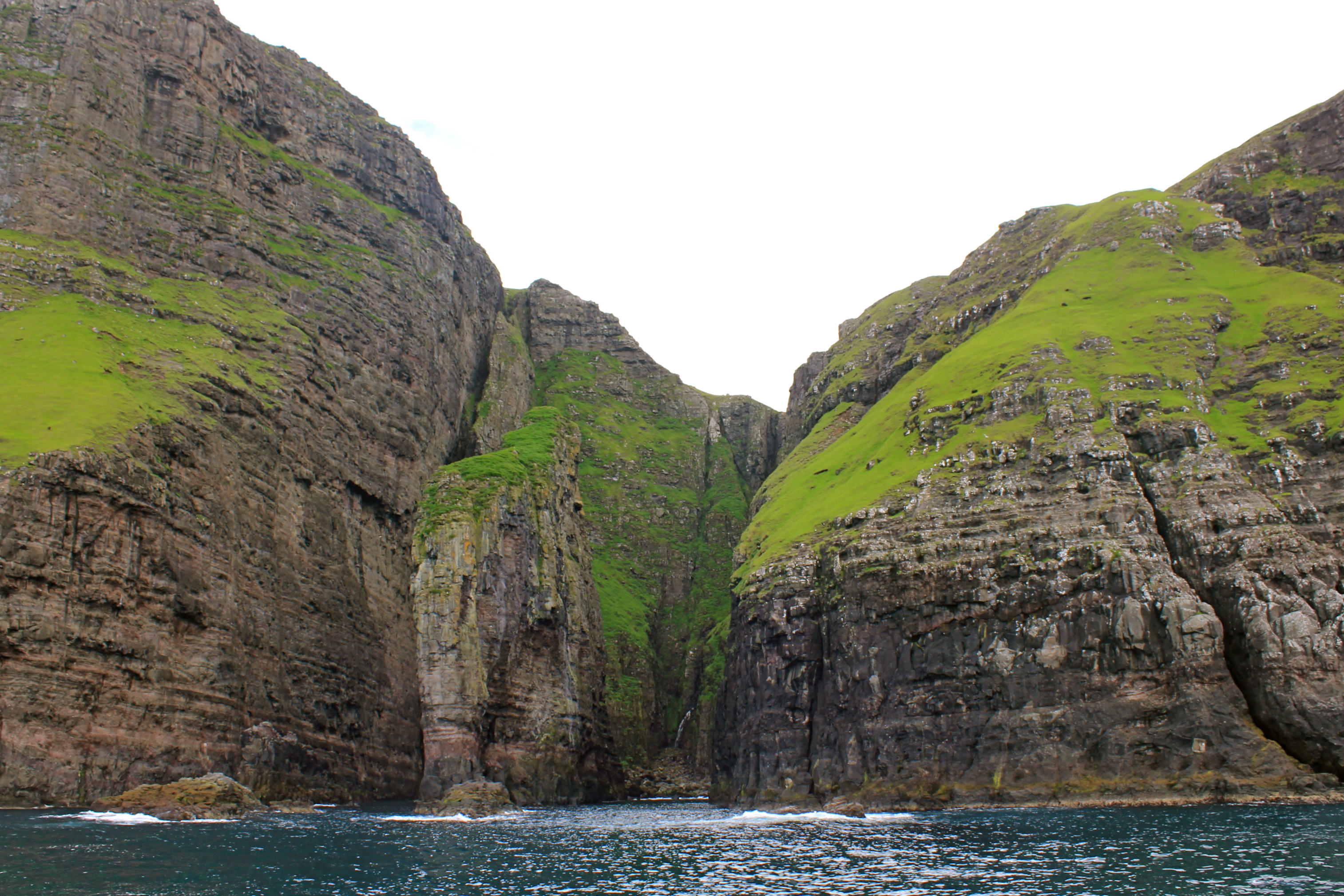 Sheep that are roaming free all over the island could be seen walking along the edges of the cliffs, which was weird to see given all the “safe” land away from the cliffs. Also, many varieties of birds were seen flying around and nesting in the cliffs Then, the boat hands began passing out hard hats for us to place on our heads. At first, I thought, “Wow, they really want to make sure we are safe, even though we were still pretty far from the cliffs.” That’s when the little boat started heading to the caves that had been created by the waves and sea currents. Floating inside the caves and between the cliffs was totally breath-taking!!