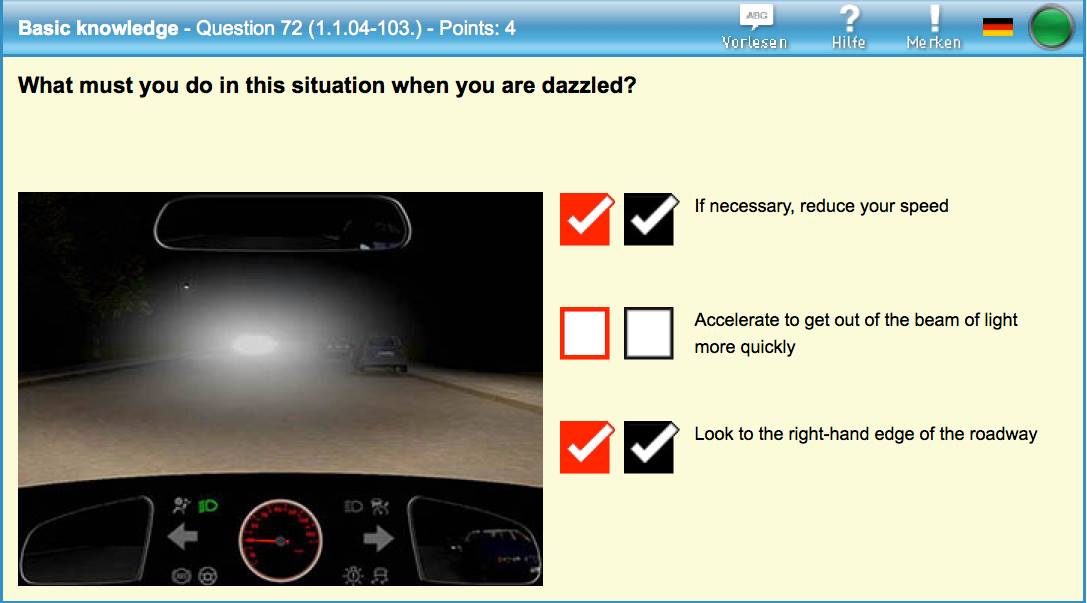 So, you have to register with a Fahrshule (Auto Driving School) and obtain access to an online portal to review the 910 possible questions that can appear on a 30 question / multiple-choice exam. Luckily, the exam can be taken in English, however it is British English and there are some differences in terminology. My favorite is what to do at night with on-coming traffic with lights that ‘dazzle’ you. And, no, waving jazz hands back is not the correct answer!