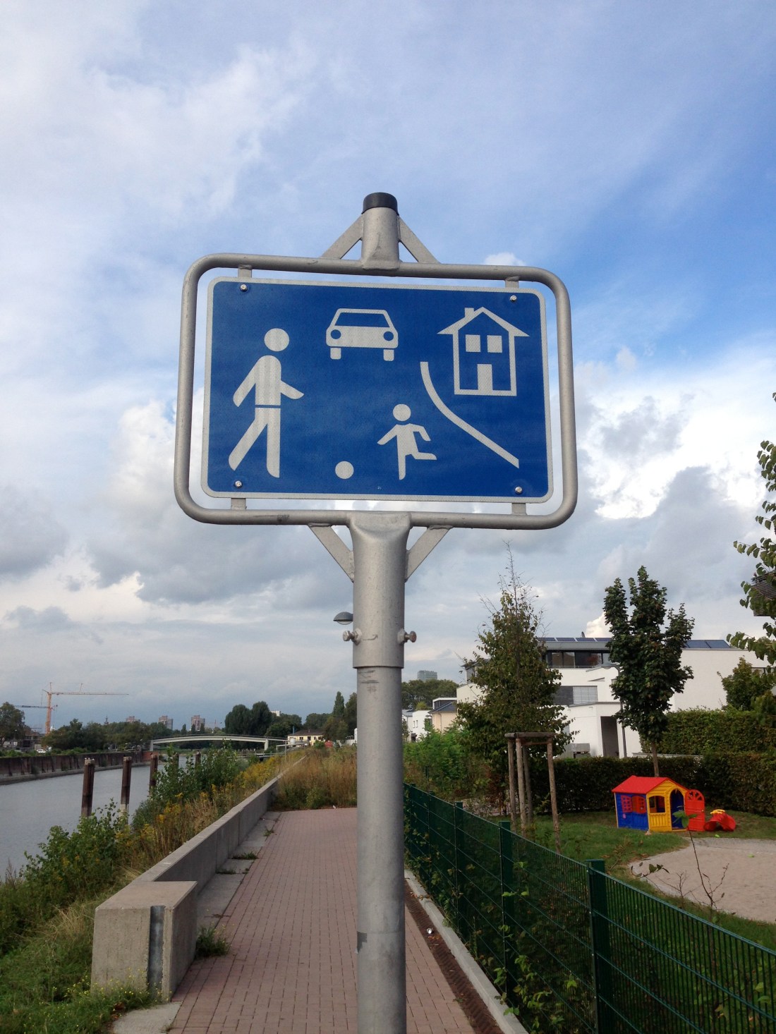 There are so many road signs that are standard across Europe, but look nothing like those in the US. The meanings may be the same, but mostly there are differences. Like the above sign. Looks confusing for those of us from the States with all the symbols! But, it is basically “Caution Children at Play” but also means a very pedestrian area. You are allowed to drive here, but only at “idle speed” which means do not use any of the gas pedal until you see the same sign with a red diagonal through it, indicating the end of this zone.