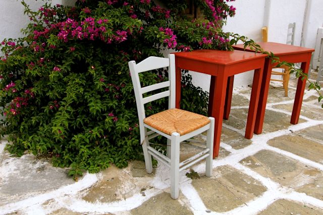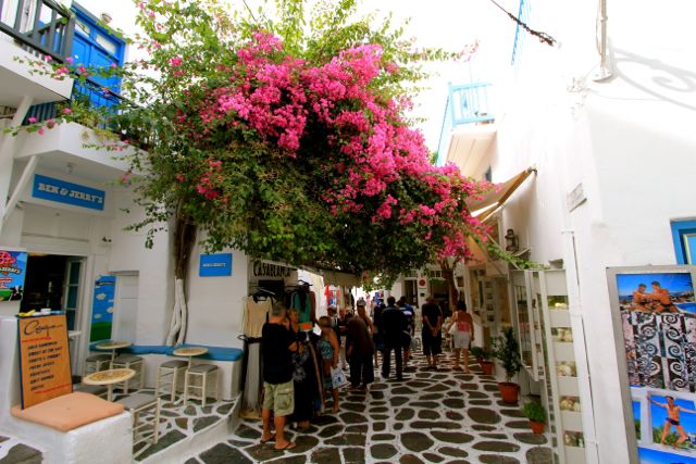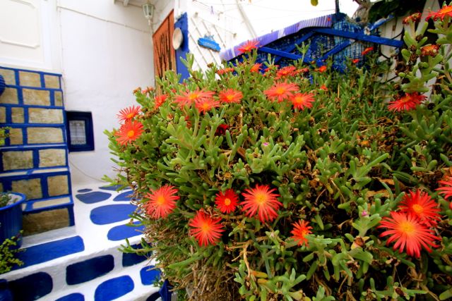The interesting thing about Mykonos is the island is fairly barren (view trees) and the buildings are white-washed stone with bright blue accents. This makes the building and colors from flowers really pop.