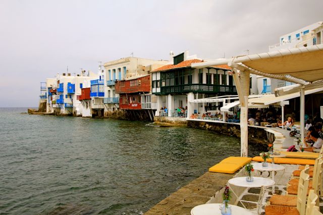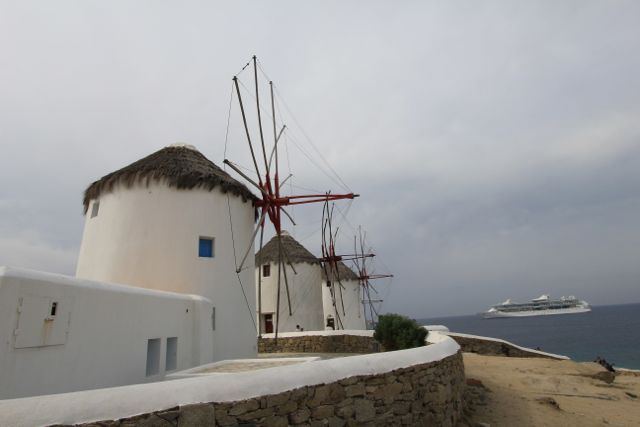 Near the windmills is a neighborhood called “Little Venice”. The buildings are right along the water front. This was my view at lunch. I was able to get a table right next to the water. I had a covered table, which was a good thing as you can see the small rain shower approaching from behind the ship.