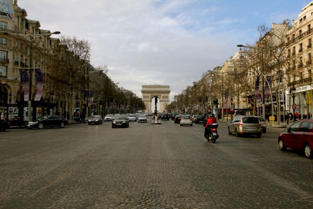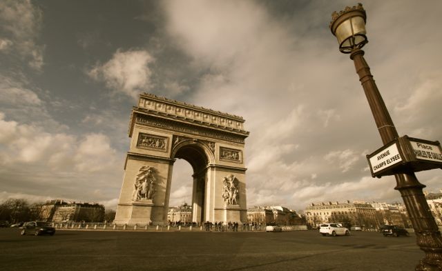 Arc de Triomphe stands 50 meters high (165ft) by 45 meters wide (150ft) by 22 meters (75 feet) deep.  Originally built to honor those that died during the French Revolution, throughout history numerous parades have been conducted around the structure both by invading armies and by the French in celebrations of victories across numerous wars.  The Arc stands at the end of the street Champs Elysees with the Louvre Museum at the opposite end.  A large traffic circle and throngs of tourists are the types of action the Arc sees today.