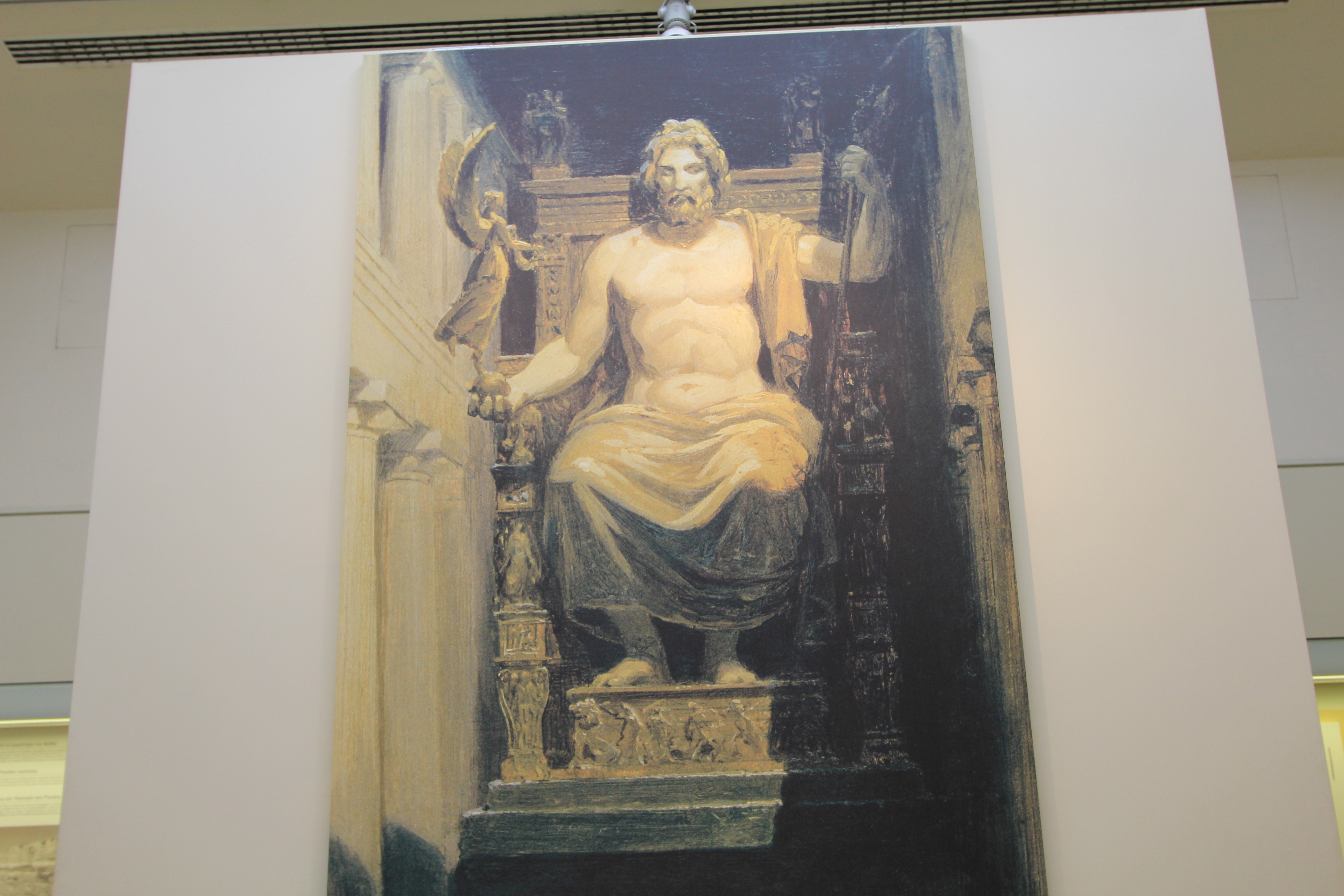 This is a picture of what the Statue of Zeus looked like inside the temple. Made of marble and gold, the statue stood 13 meters (43 feet) tall. In his right hand, is Nike the Greek God of victory (and the origin of the name of the shoe company).