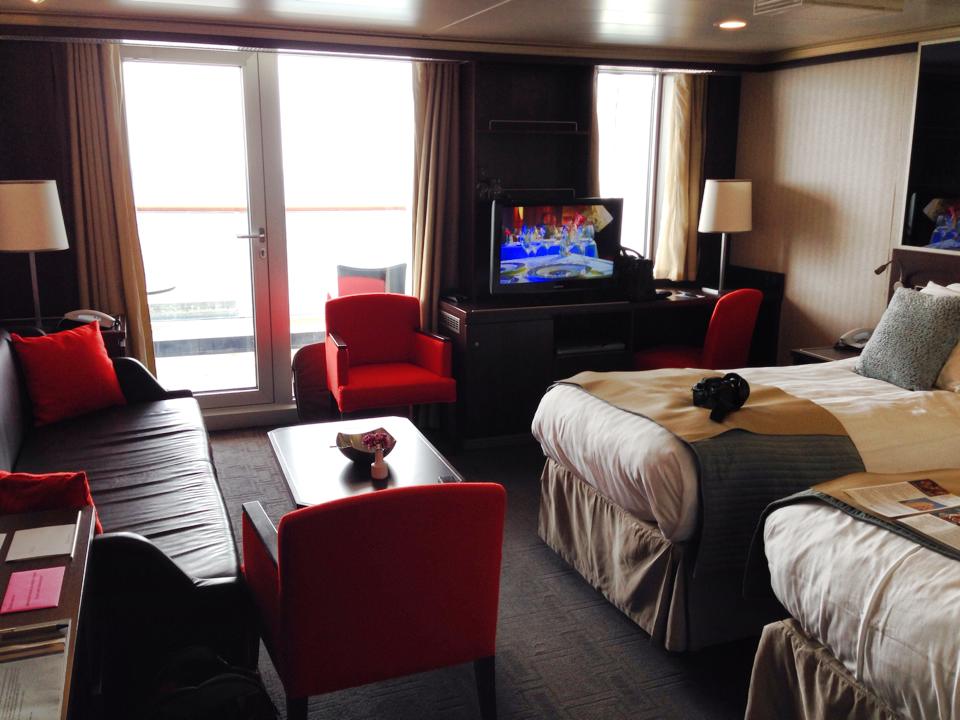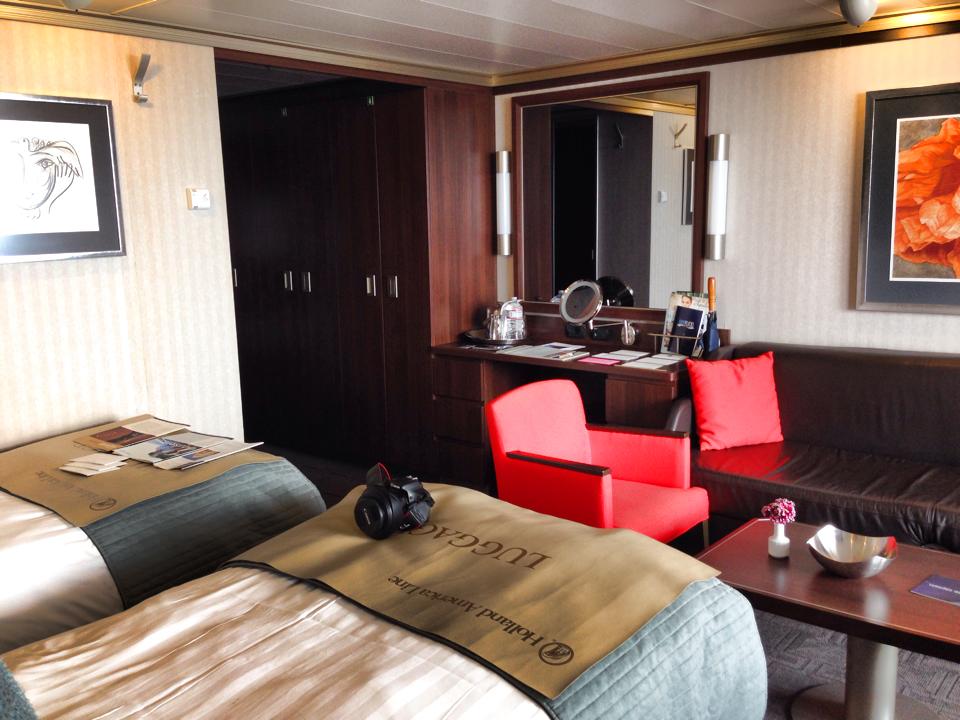 As far as the ship goes, our first cruise was with Holland America and coincidentally on the same ship the Eurodam. We had not planned that, as we booked based on the itinerary. We did however, enjoy a Superior Suite room with plenty of room and a large balcony. The pictures below show how the room was setup when we arrived, as we had the stewards place the beds together.
