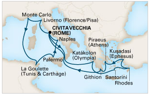 In total, we visited the countries of Italy, Greece, Turkey, Monaco, France, and Tunisia, which are on the three continents of Europe, Asia (Turkey), and Africa (Tunisia). For the entire trip, the weather was fantastic!! Clear skies and temperatures in the 60s to 70s during the day. We did have some poor weather though that impacted our excursions: