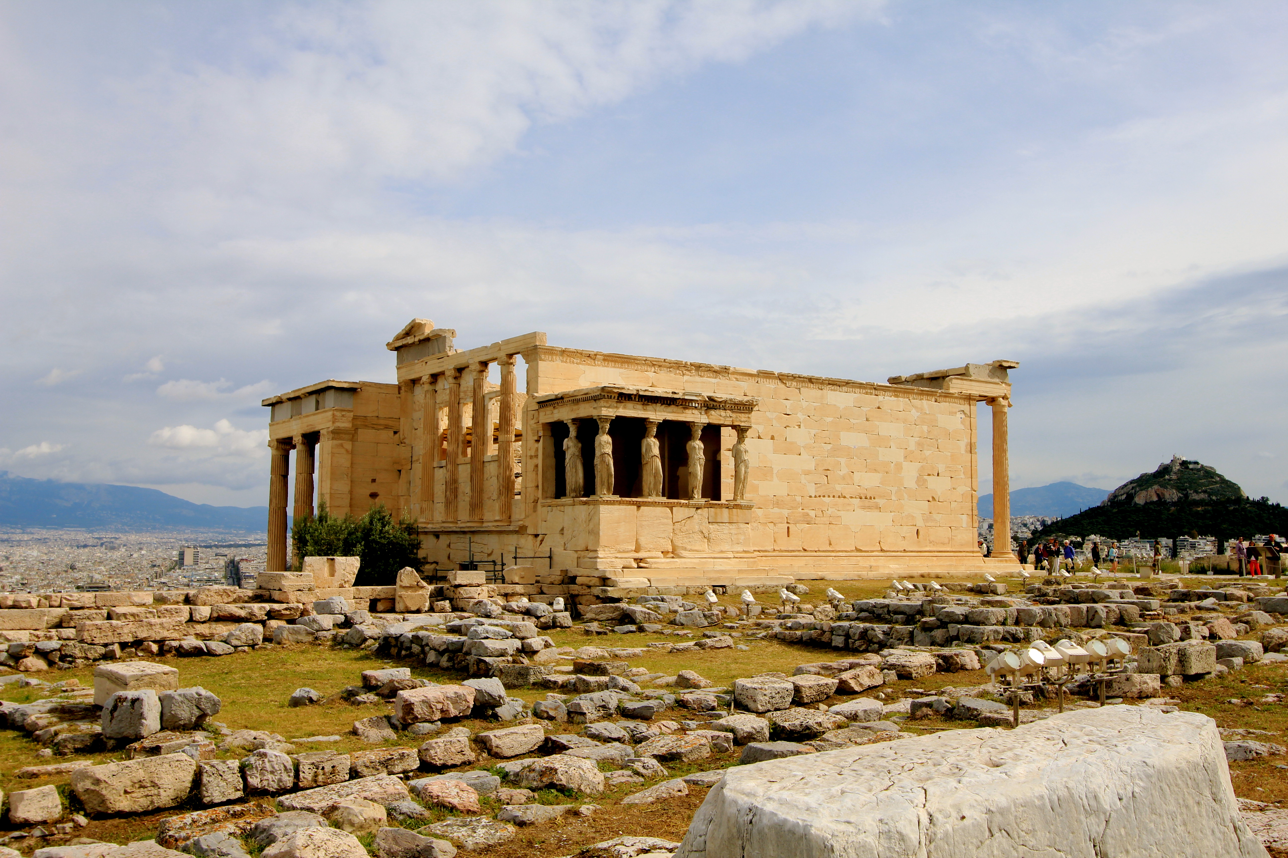 IMG_0240To the side of the Parthenon “The Erechtheum” that was built between 421BC and 407BC and is at the north side of the Acropolis. It is situated on the most sacred site of the Acropolis, legend has it that it’s the place Poseidon left his trident marks and where Athena’s olive tree grew during their competiton to name the city. It is thought to be named after the legendry Greek hero Erechtheus, who according to myths was a king of Athens.