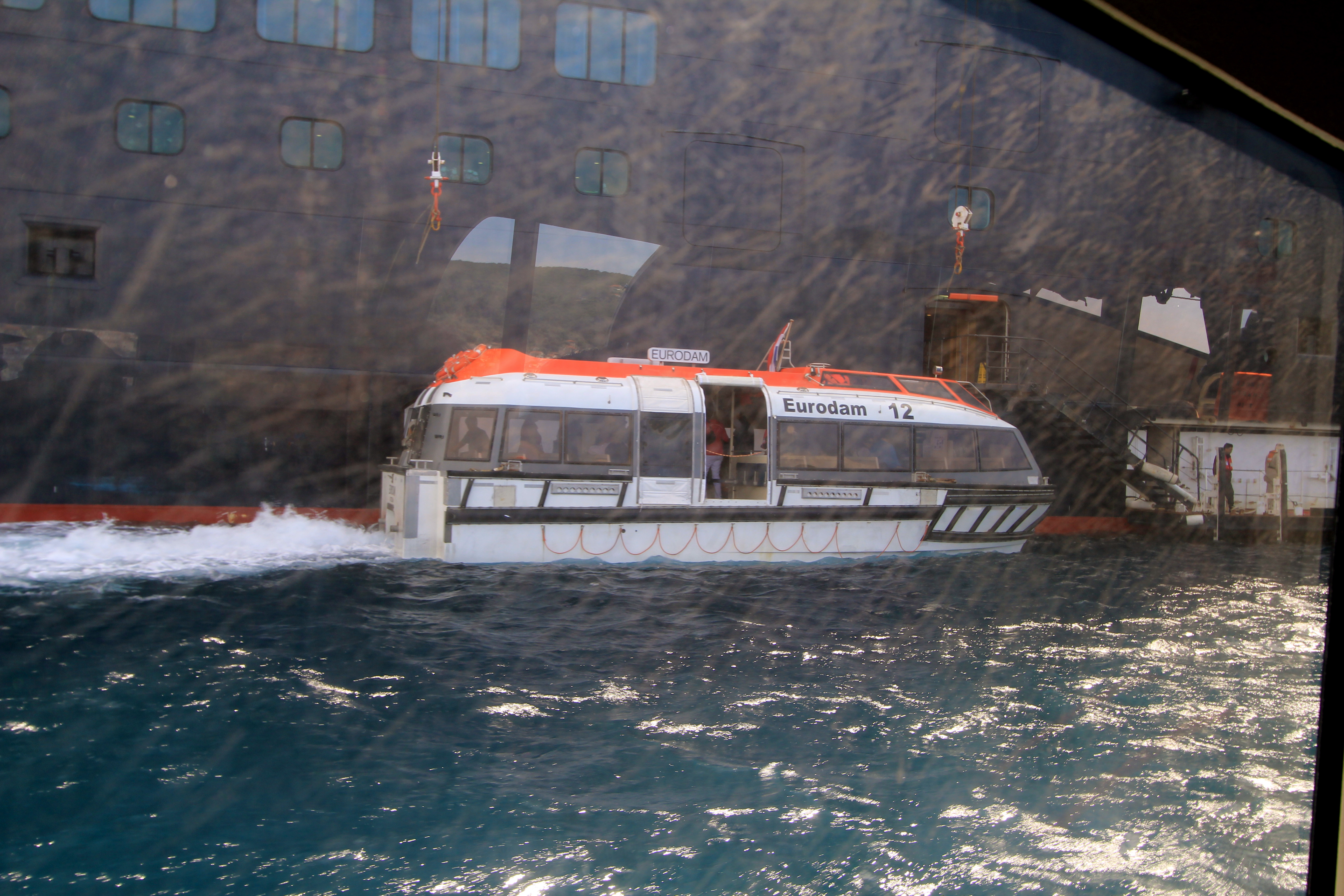 The tenders coming around the side of the ship to take and pickup the passengers who went ashore.