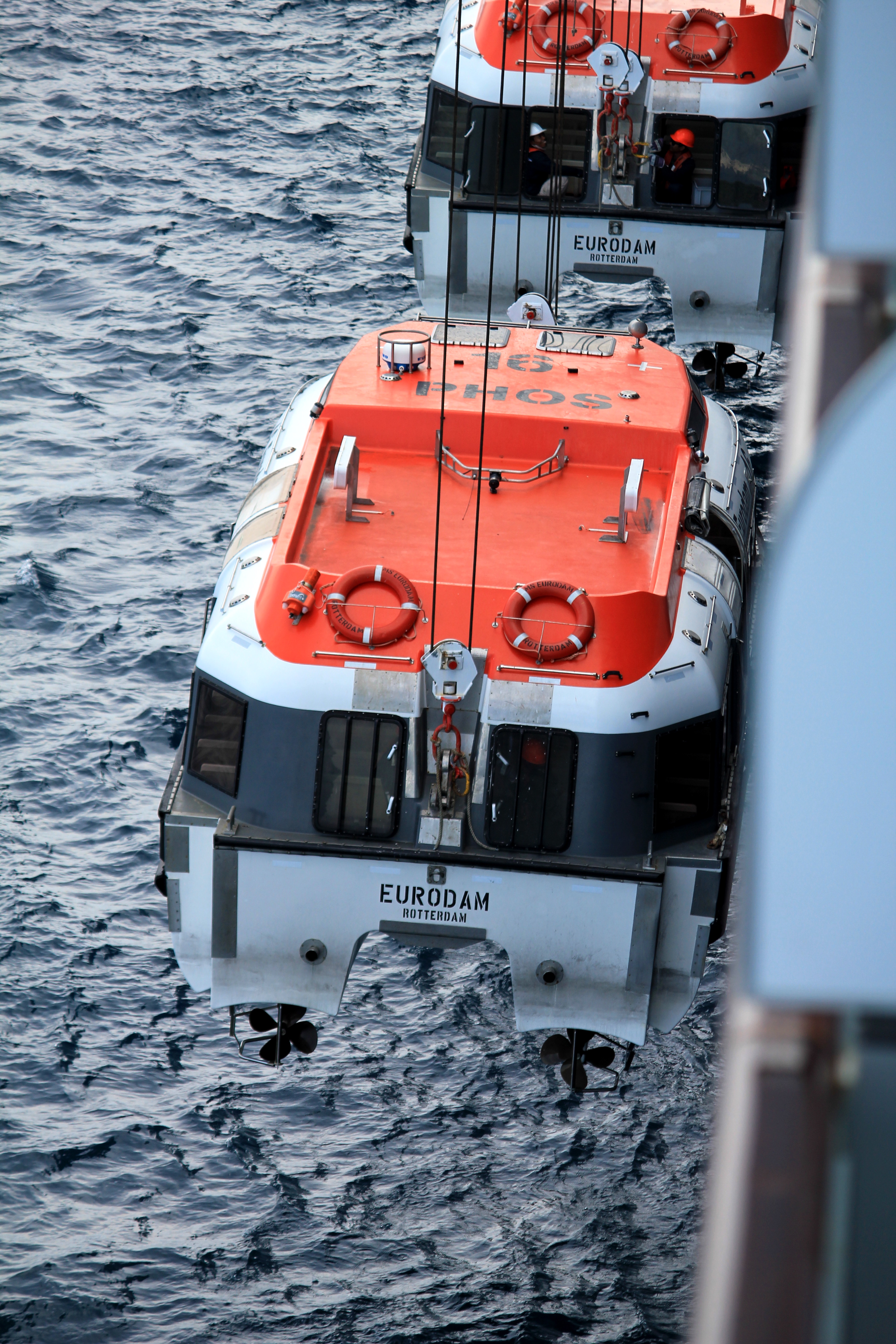 When it is time for the cruise ship to leave the tender boats are lifted out of the water and placed beside the other life boats.