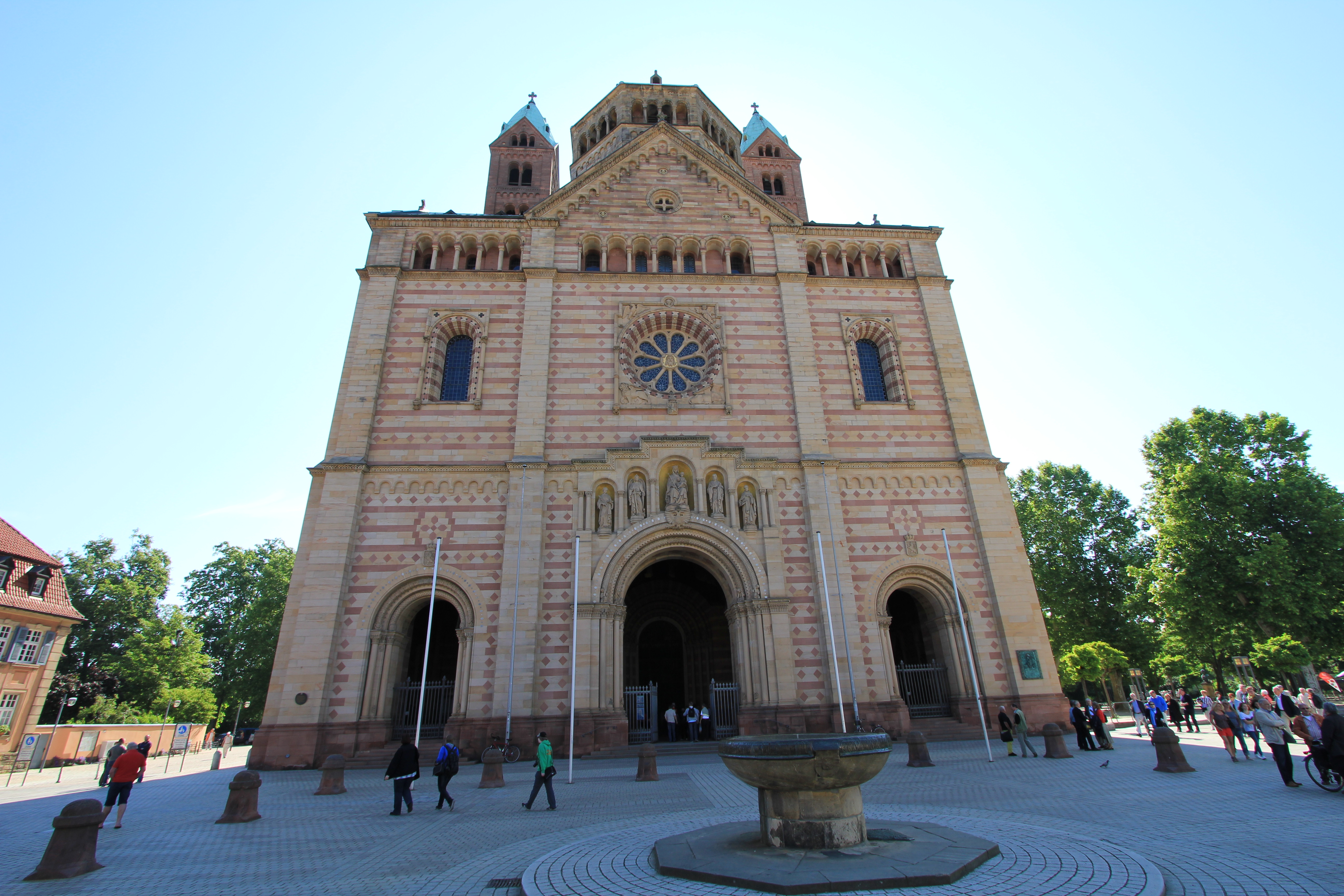 The catholic Speyer Cathedral, the most visible landmark in Speyer. Begun in 1030 under Conrad II, the imposing triple-aisled vaulted basilica of red sandstone is the largest Romanesque architecture-style church.