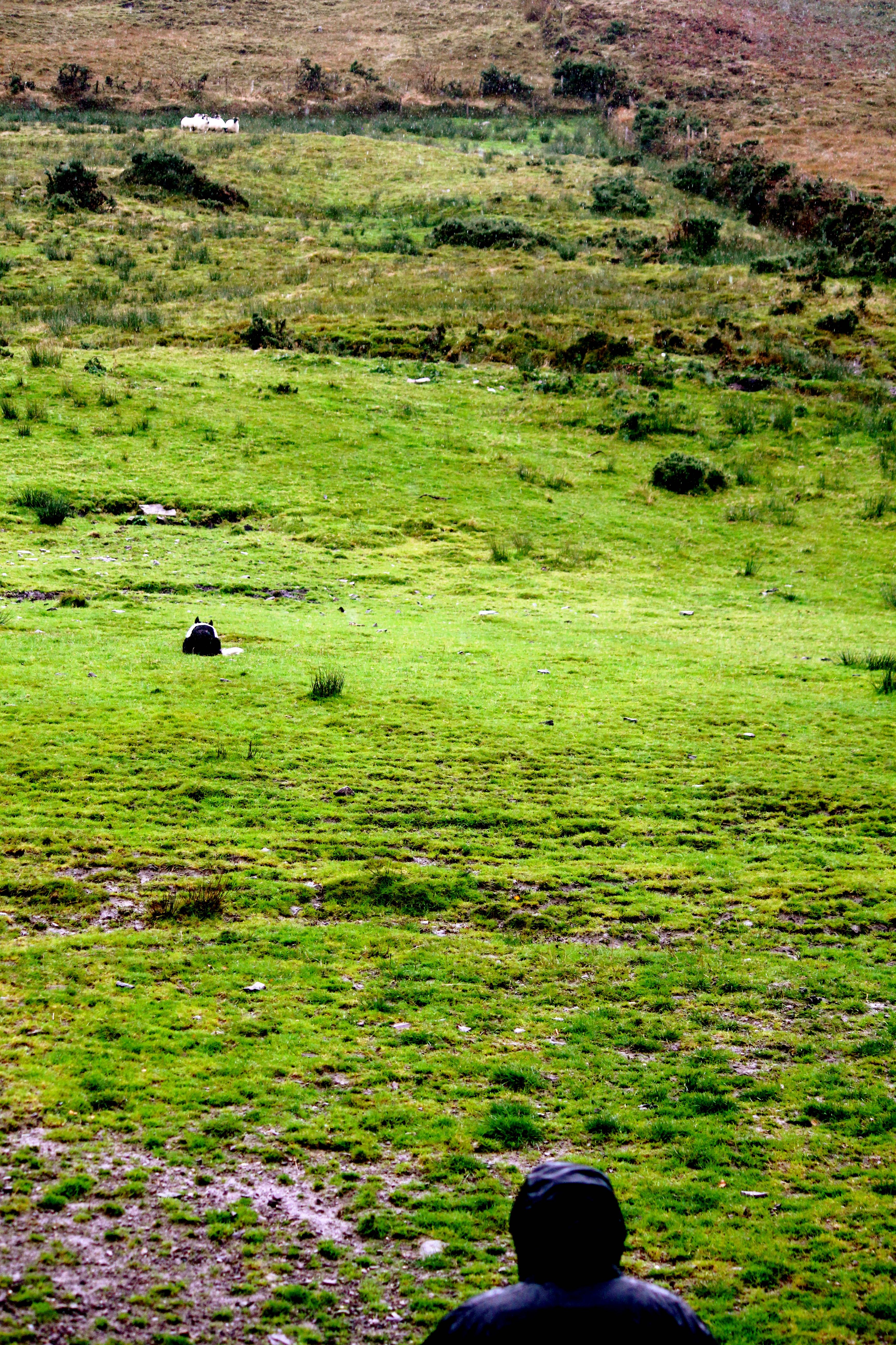 It was raining during our stop, so we are under a shelter watching. The shepherd stood at the bottom of the hill and gave commands to his two dogs to go up the hill to the sheep and make them come back down.