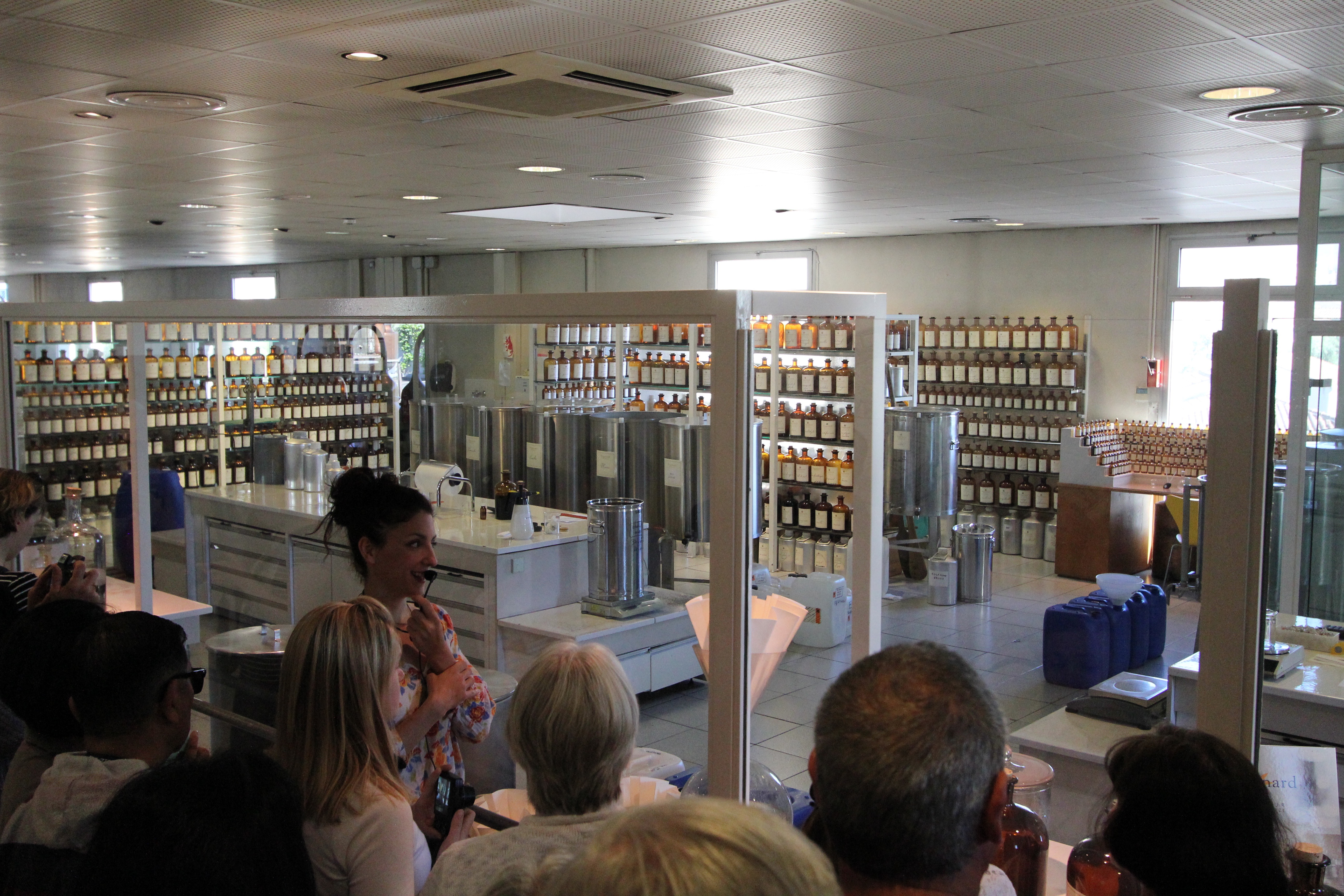 At the Fragonard Perfume Factory in Grasse, France, with our guide explaining how flowers & spices from around the world are used in the making of perfumes and soaps with some taking up to 250 different types just for one perfume scent.