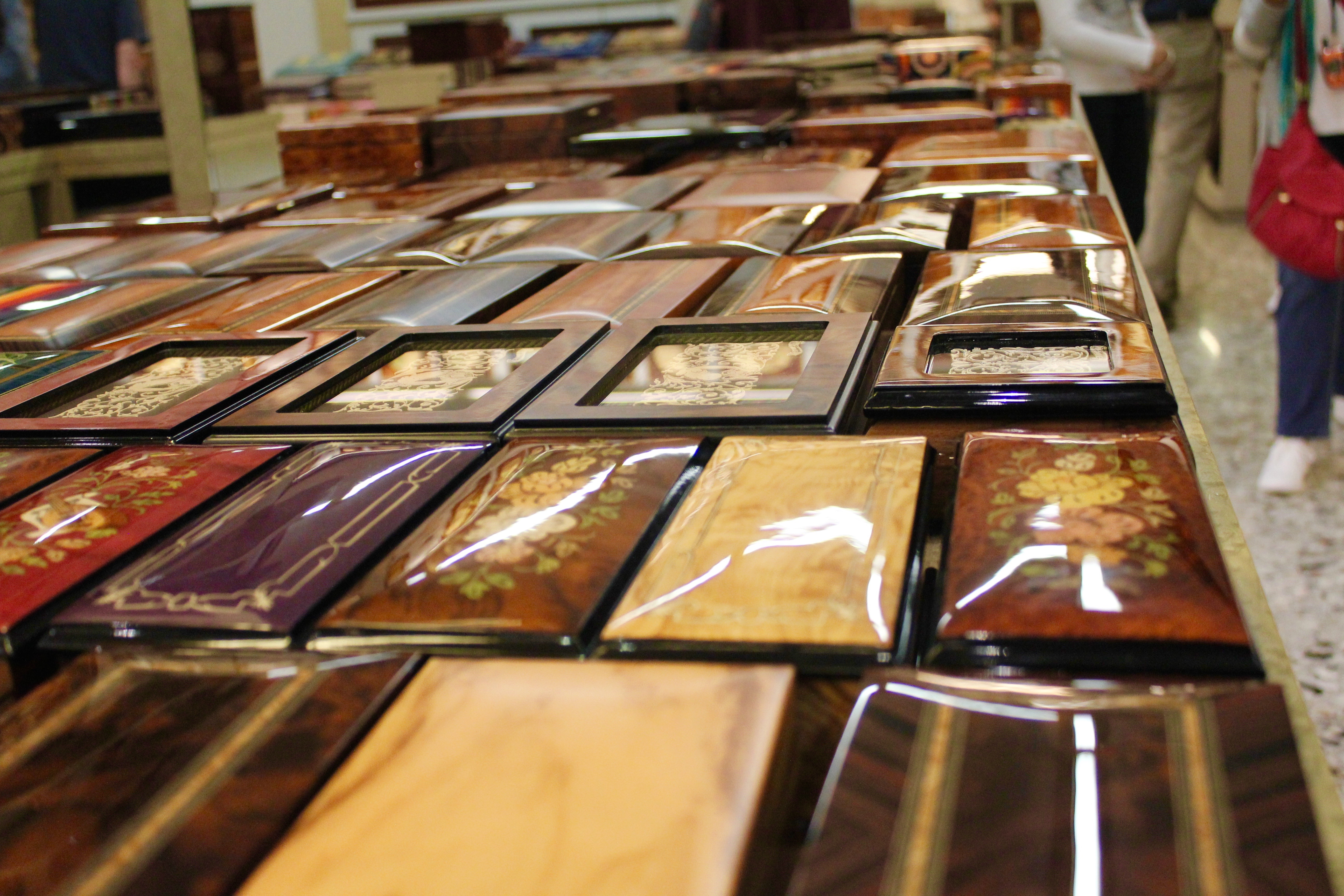 We had a demonstration of how inlaid wood art is made, which is very popular in this part of Italy. Here the artisan trims very small pieces of thin, colored wood to build the picture. Then, the pieces are assembled to form the picture being made….