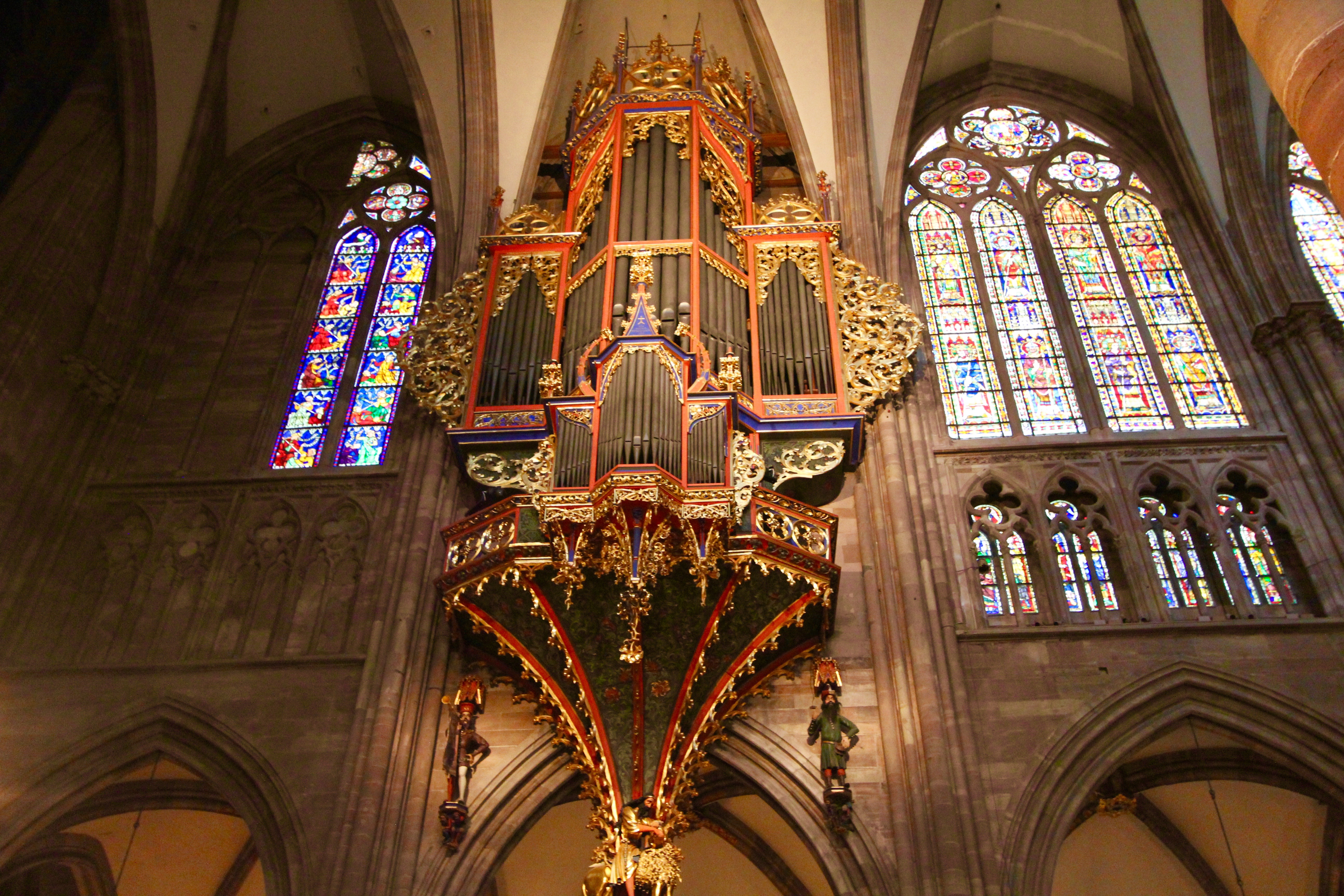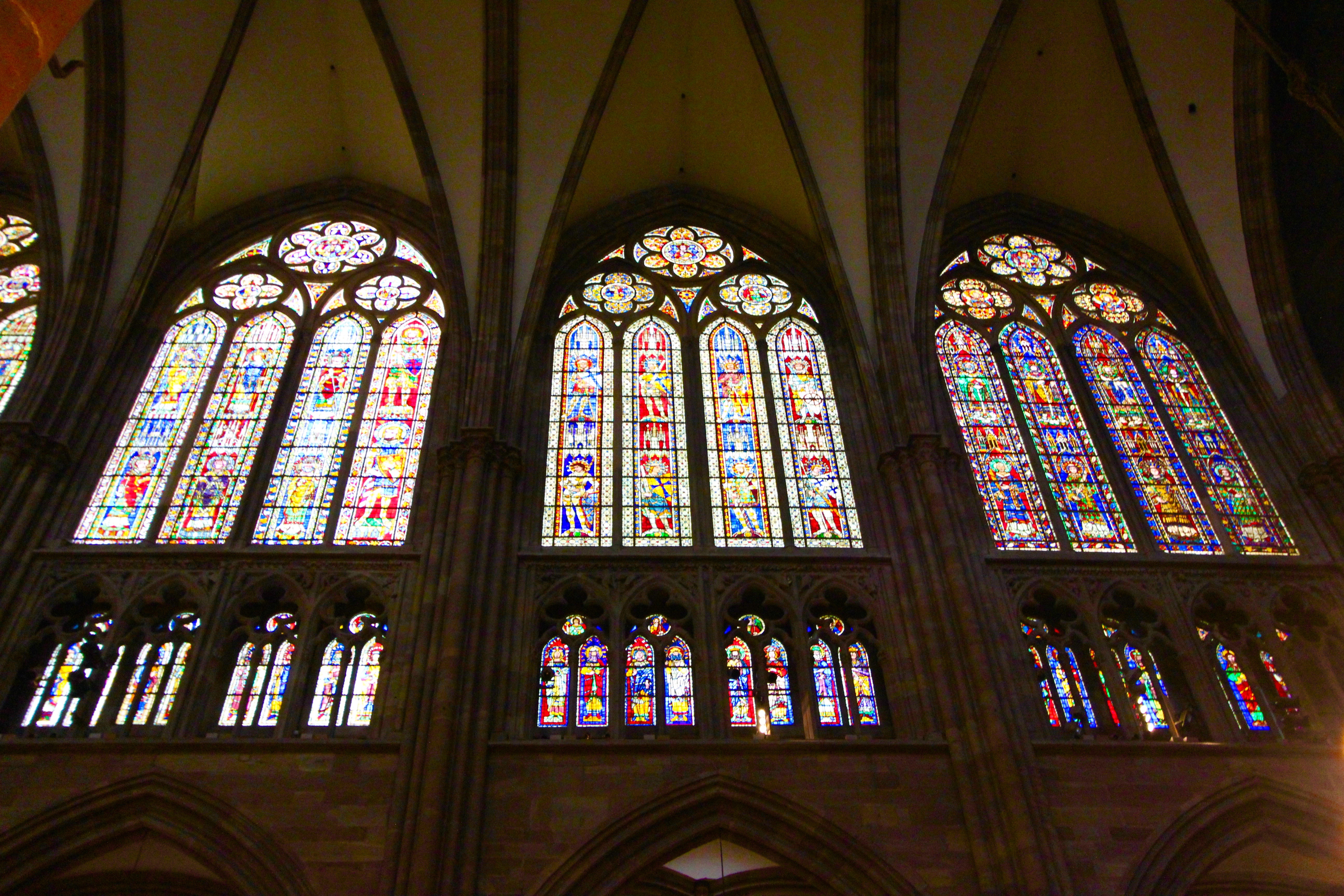 In most large European cathedrals, typically you find reproduction stained glass windows, as most were damaged from the many wars during history. But, as Germany invaded Strasbourg during the beginning of World War II, the Germans had the foresight to remove the original 12th & 14th century stained glass windows for protection. The windows were taken to the German city of Heillbronn for protection deep in the salt mines located there.