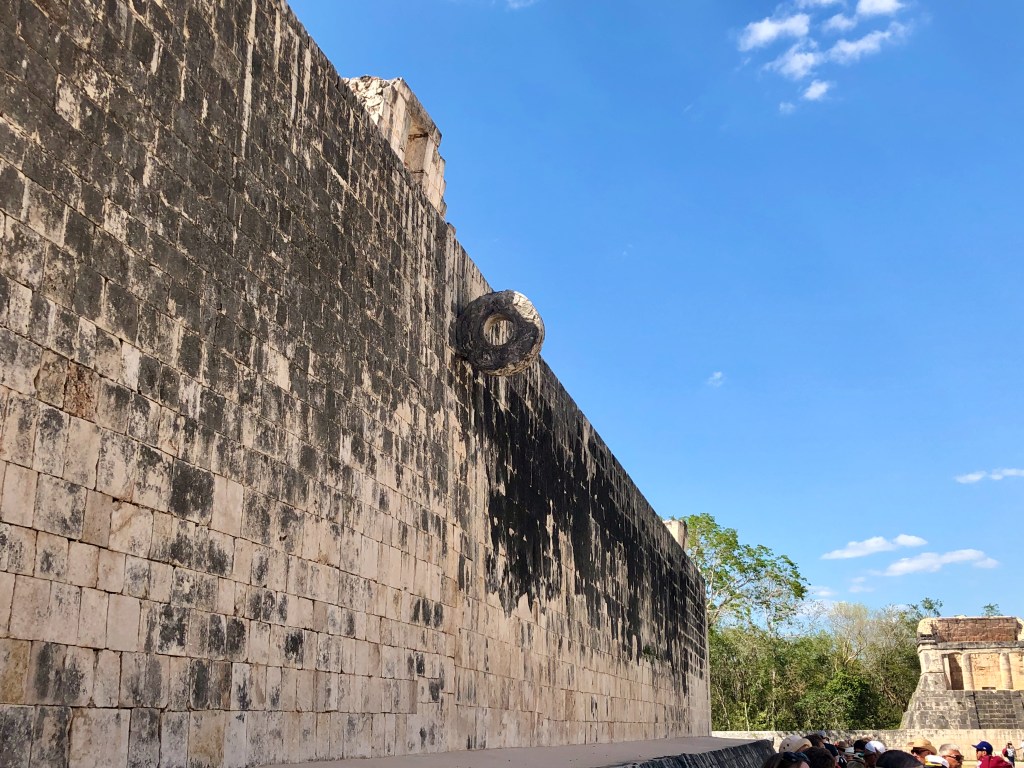 As far as the game, a stone circle stands 8 meters tall with the opening sticking out from the wall. Players scored by getting a 4kg (9 pound) rubber ball through the opening on either side while the opposing team physically fought to prevent this from happening. The tops of the walls are platforms where spectators watched. The game typically became a ritual event combined with religious human sacrifice.
