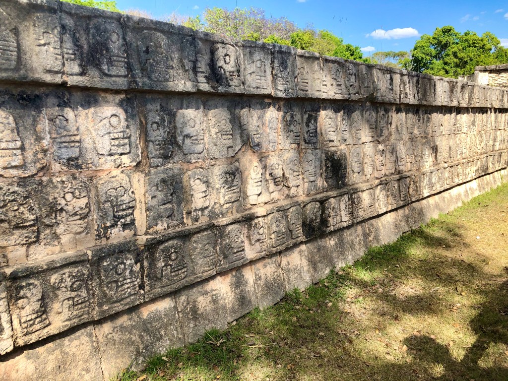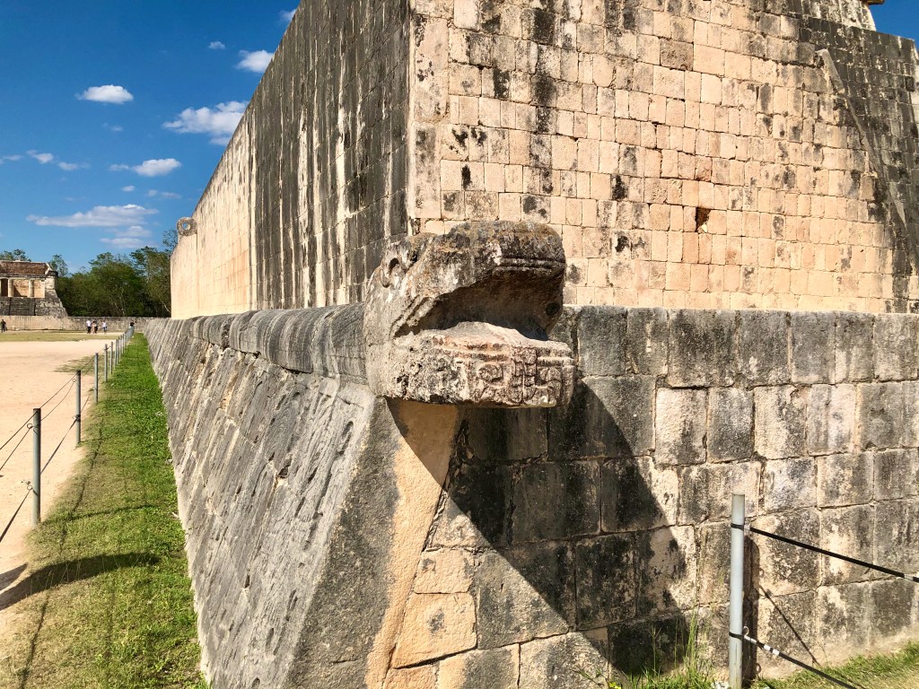 Another impressive structure is the “Great Ball Court” – that measures 168 x 70 meters (551 x 230 feet) with the walls standing 8 meters (26 feet) high. On each end of the court is a Temple, and along the stone walls of the court are carvings of faces and men being decapitated – which evidently was the outcome of the potential loser of the game.